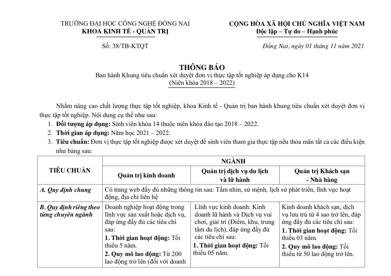 14:00 - 02-11-2021 0 Ban hành Khung tiêu chuẩn xét duyệt đơn vị thực tập tốt nghiệp áp dụng cho K14 (Niên khóa 2018 – 2022)
