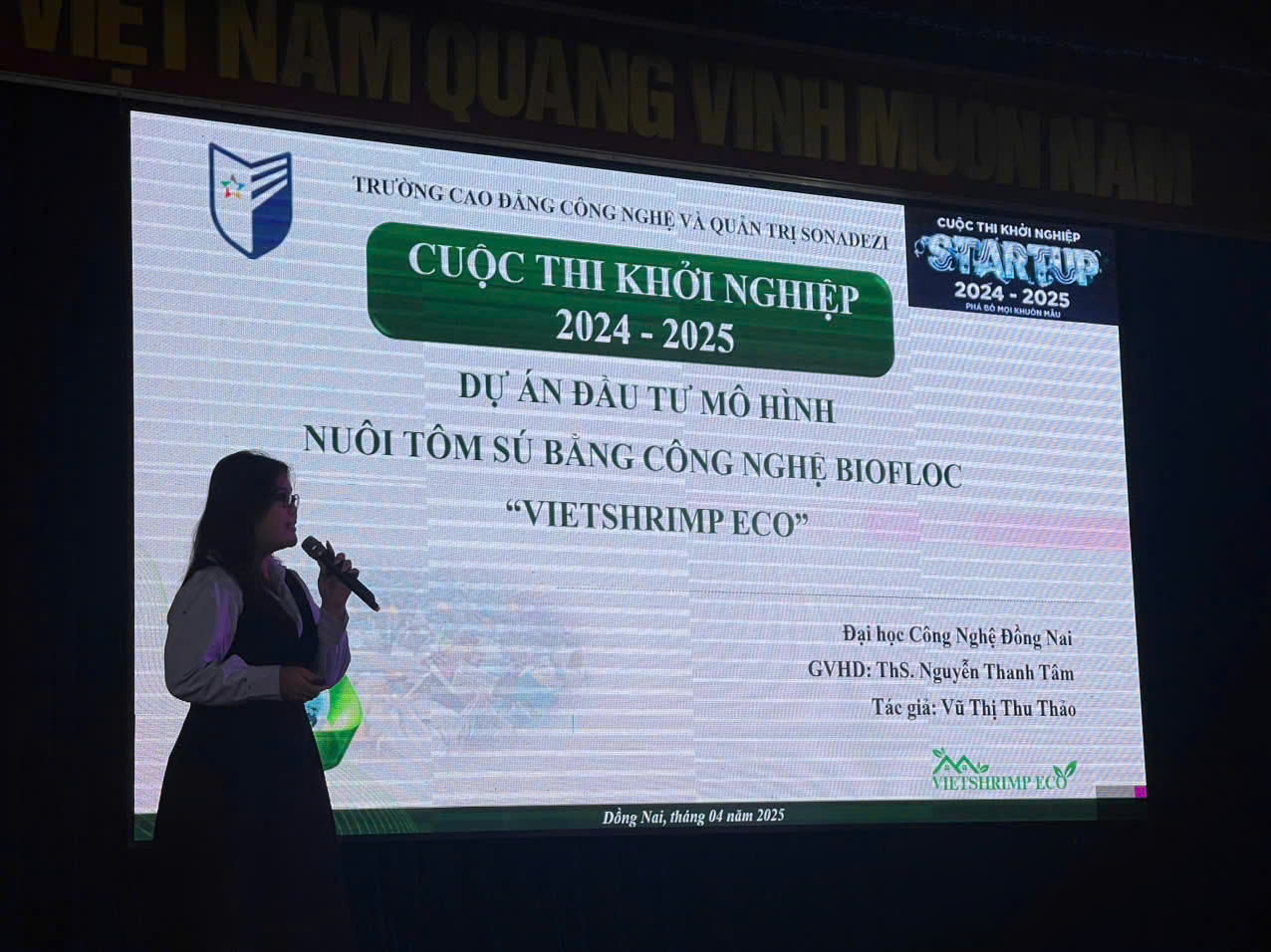 Vietshrimp Eco là đứa con tinh thần của Vũ Thị Thu Thảo, được hình thành từ những trăn trở và khát vọng lớn lao đối với ngành thủy sản Việt Nam. Không có một đội nhóm hùng hậu phía sau hỗ trợ, chỉ có một cô gái nhỏ miệt mài nghiên cứu, tìm hiểu số liệu bên ánh đèn bàn học và chiếc laptop của mình. Với khát khao cống hiến, đóng góp cho đất nước, cô gái ấy đã tiếp tục ghi dấu ấn của mình vào thành tích của đội thi đến từ Trường Đại học Công Nghệ Đồng Nai.