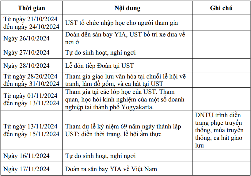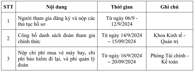 Căn cứ kế hoạch số 04/KH-KTQT về việc tổ chức cho sinh viên, học viên tham gia chương trình trao đổi học thuật, giao lưu văn hóa ngắn hạn với Trường đại học Sarjanawiyata Tamansiswa, Indonesia đã được Hội đồng trường, Ban Giám hiệu ký duyệt vào ngày 07/09/2024, Khoa Kinh tế - Quản trị thông báo về việc tổ chức cho sinh viên, học viên tham gia chương trình trao đổi học thuật, giao lưu văn hóa ngắn hạn gồm các nội dung như sau: