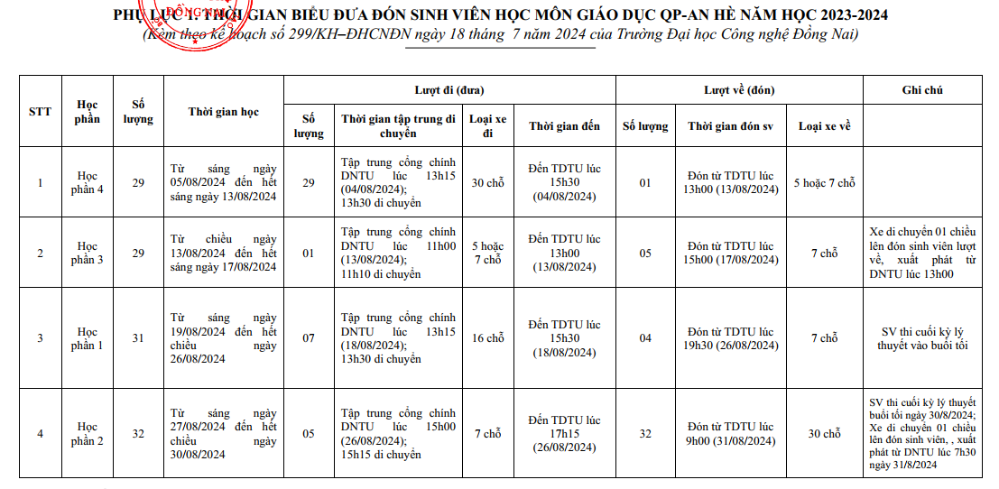 Kế hoạch Giáo dục Quốc phòng và An ninh Học kỳ hè 2023-2024 DNTU