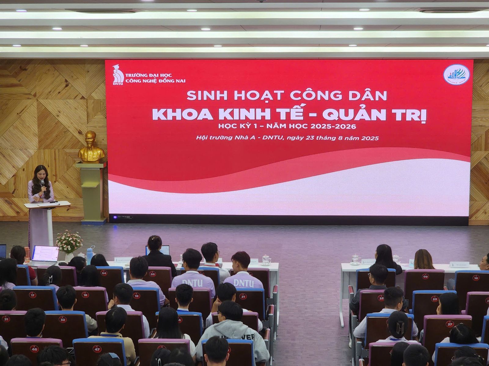Chiều ngày 23/8/2025, Khoa Kinh tế - Quản trị, Trường Đại học Công nghệ Đồng Nai đã tổ chức buổi sinh hoạt công dân học kỳ I, năm học 2025-2026 theo kế hoạch chung của Nhà trường. Đây là hoạt động thường niên nhằm giúp sinh viên cập nhật thông tin mới, định hướng học tập và rèn luyện ngay từ đầu năm học.