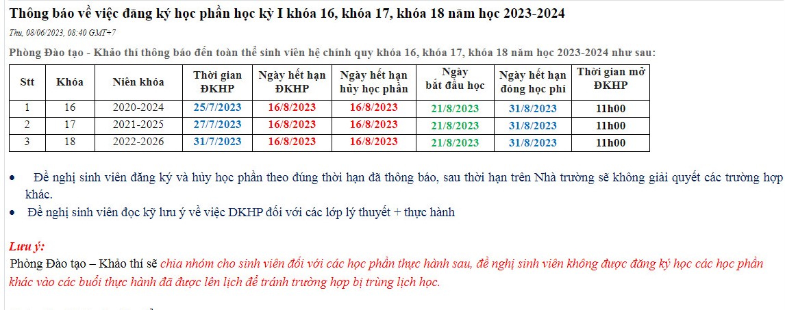 THÔNG BÁO ĐĂNG KÝ HỌC PHẦN CHO HK1 - CÁC KHÓA 16,17,18 (NĂM HỌC 2023 - 2024)