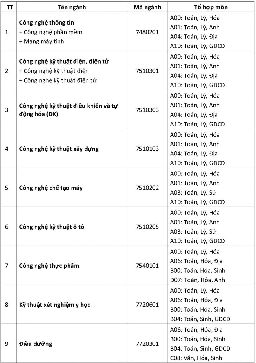 Đối với Khối ngành sức khoẻ (Kỹ thuật xét nghiệm y học, Điều dưỡng) xét tuyển học sinh có học lực lớp 12 xếp từ loại khá trở lên và mức điểm xét tuyển điểm trung bình cộng của 3 môn trong tổ hợp xét tuyển đạt từ 6,5 điểm trở lên, ngưỡng đảm bảo chất lượng đầu vào cụ thể theo quy định của Bộ Giáo dục và Đào tạo.